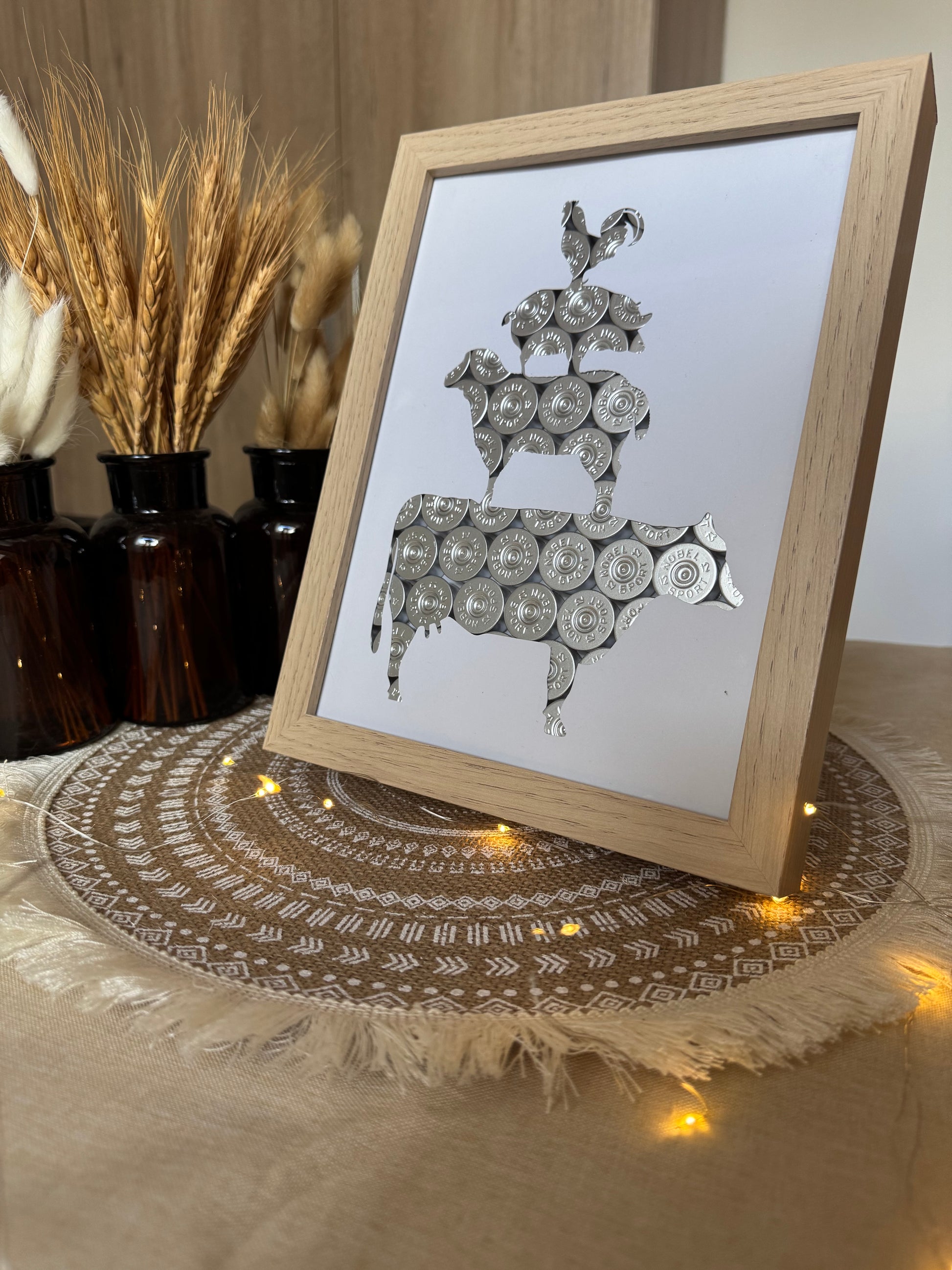 Magnifique cadre avec les animaux de la ferme avec des culots de cartouches argentés, une somptueuse feuille blanche laissant apparaitre la belle forme des animaux et pour finir un très jolie cadre effet bois.