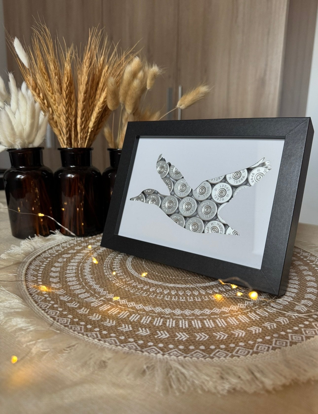 Je vous fait découvrir de magnifiques cadres fabriqués à la main par mes soins. Utilisant comme matière première des culots de cartouches de fusils. Idéale pour un magnifique cadeau ou simplement pour habiller votre intérieur de façon sobre et décalée !
