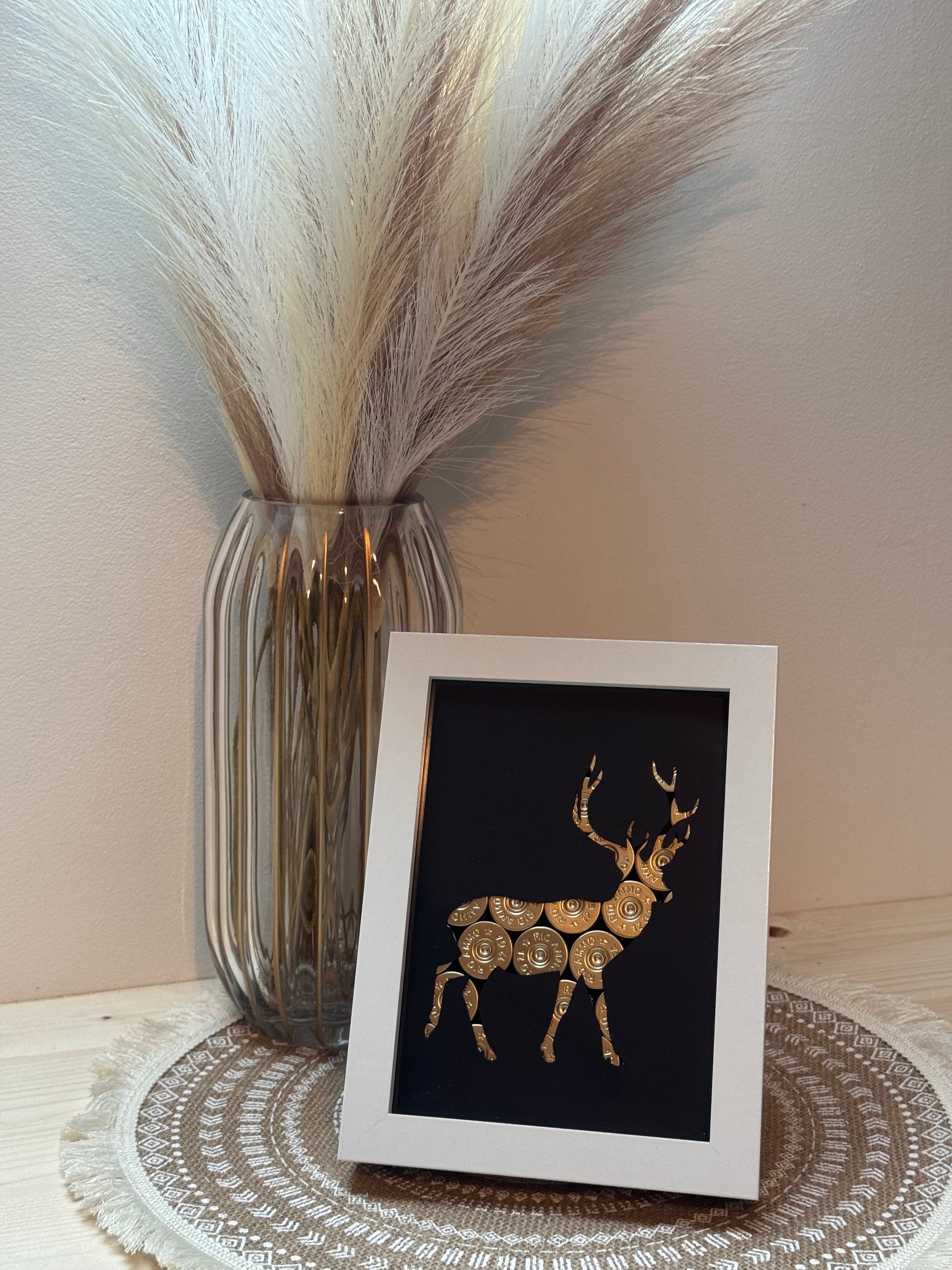 Magnifique cadre cerf avec des culots de cartouches dorés, une somptueuse feuille noire laissant apparaitre la belle forme du cerf et pour finir un très jolie cadre blanc.