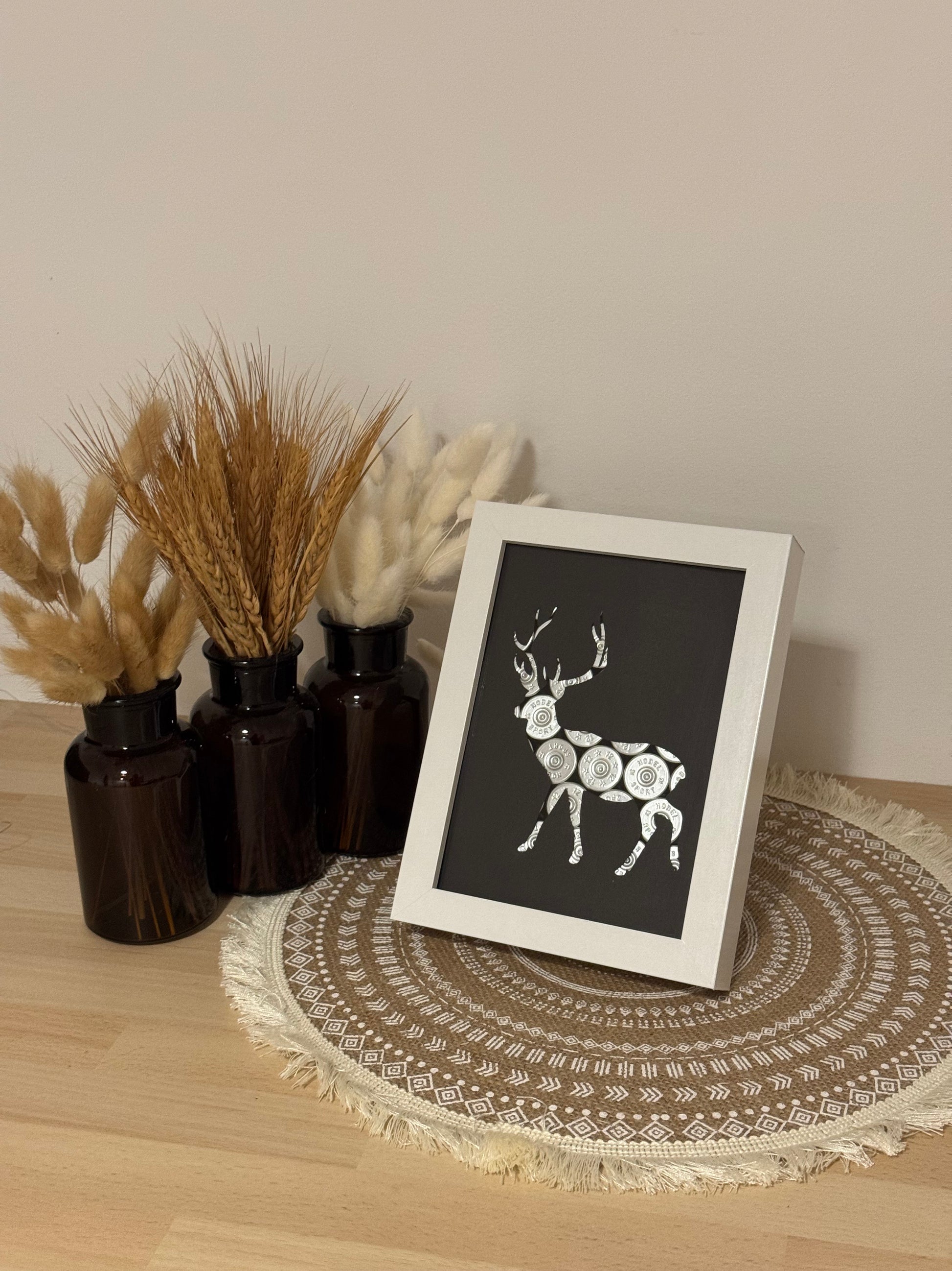 Magnifique cadre cerf avec des culots de cartouches argentés, une somptueuse feuille noire laissant apparaitre la belle forme du cerf et pour finir un très jolie cadre blanc.