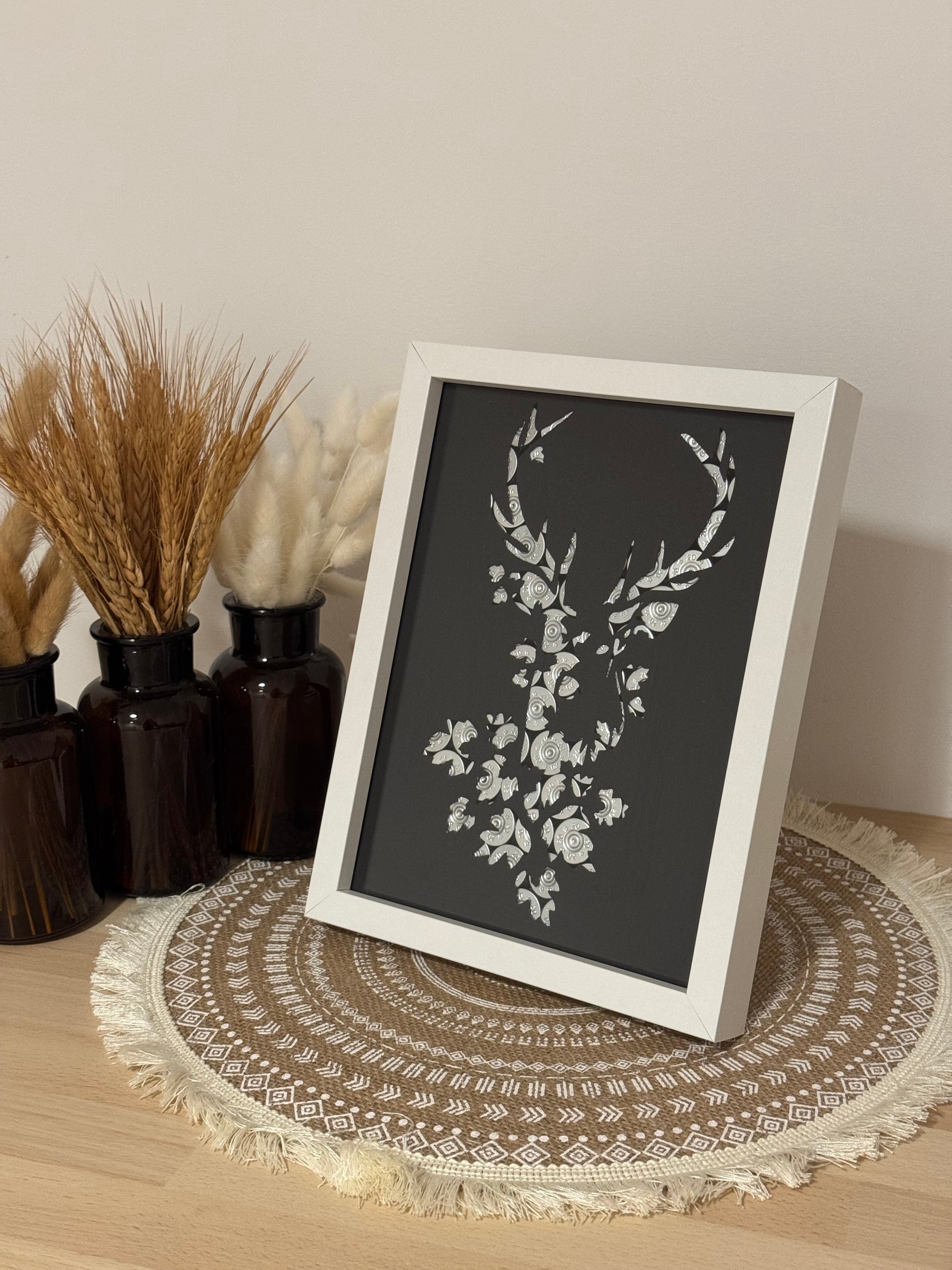 Magnifique cadre cerf et feuilles avec des culots de cartouches argentés, une somptueuse feuille noire laissant apparaitre la belle forme du cerf et pour finir un très jolie cadre blanc.