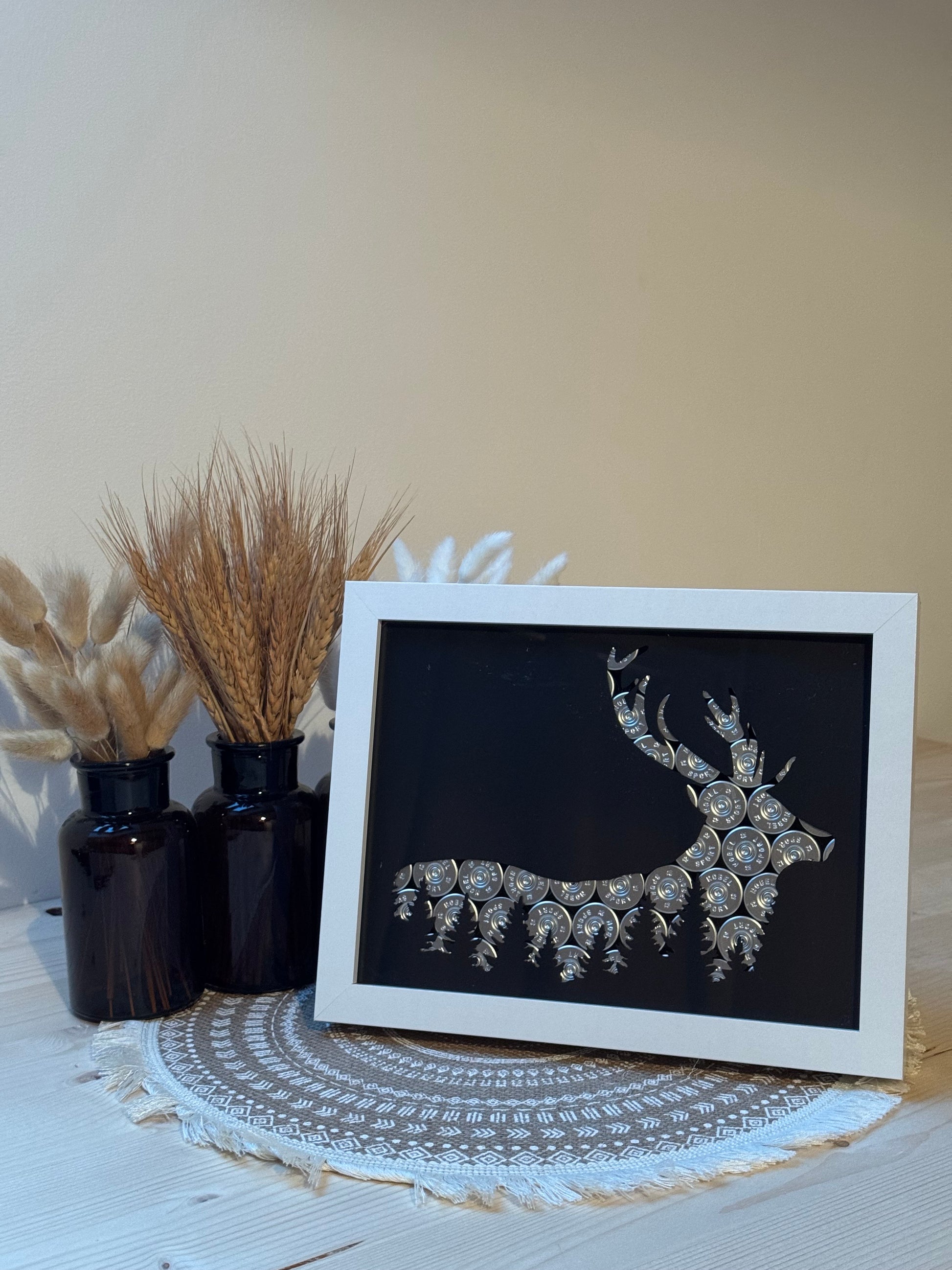 Magnifique cadre cerf et forêt avec des culots de cartouches argentés, une somptueuse feuille noire laissant apparaitre la belle forme du cerf et de la forêt et pour finir un très jolie cadre blanc.