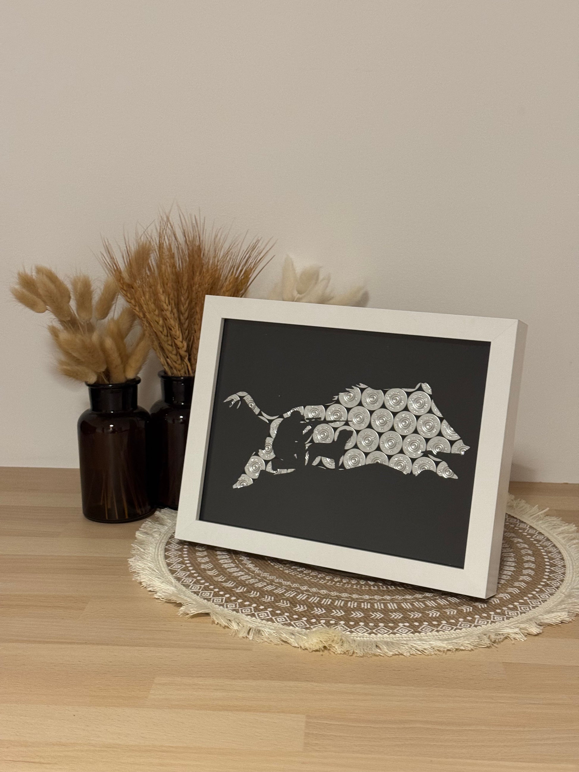 Magnifique cadre chasseur, chien et sanglier avec des culots de cartouches argentés, une somptueuse feuille noire laissant apparaitre la belle forme du sanglier et pour finir un très jolie cadre blanc.