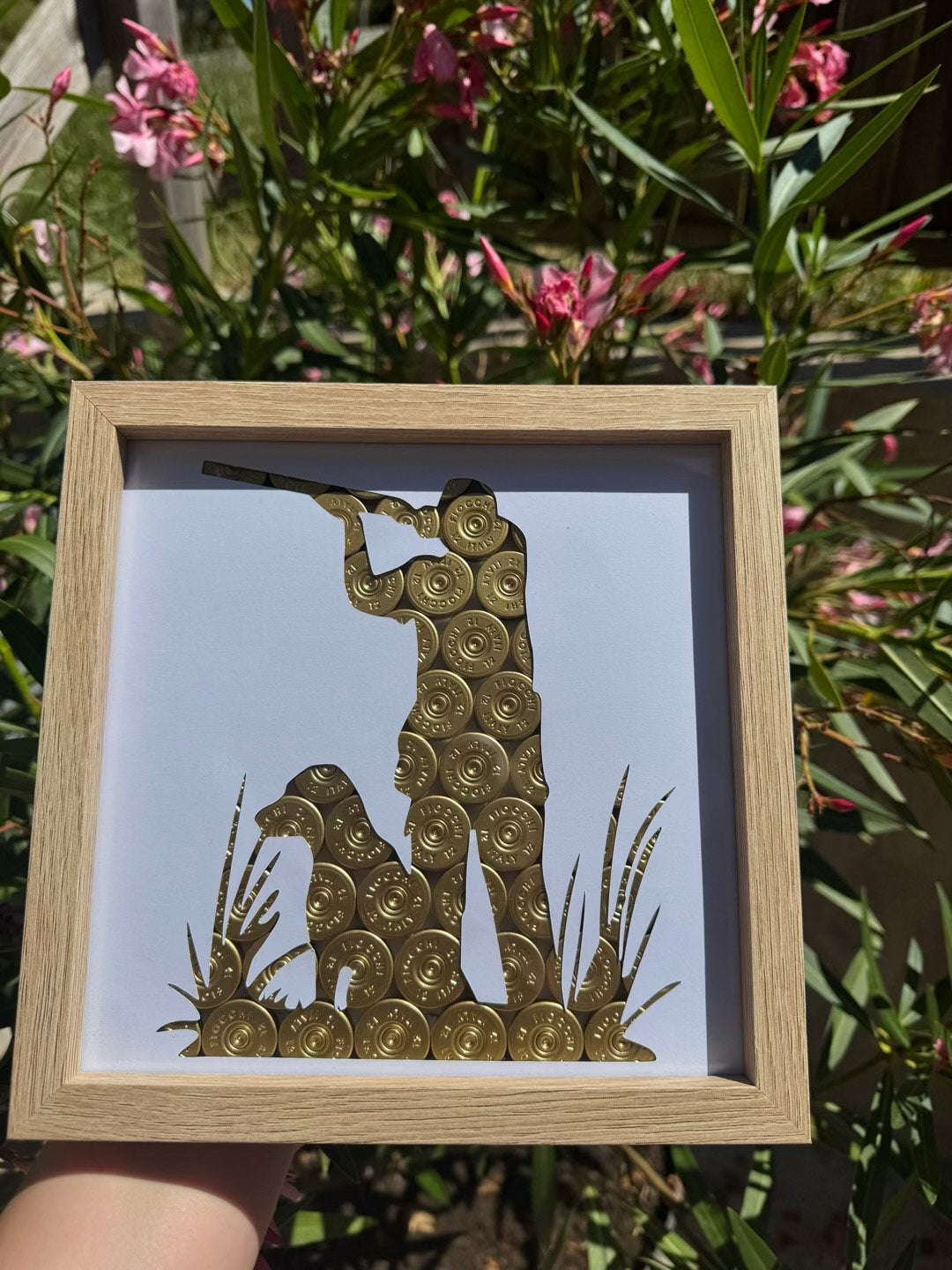 Magnifique cadre chasseur avec son chien avec des culots de cartouches dorés, une somptueuse feuille blanche laissant apparaitre la belle forme du chasseur et du chien et pour finir un très jolie cadre effet bois.