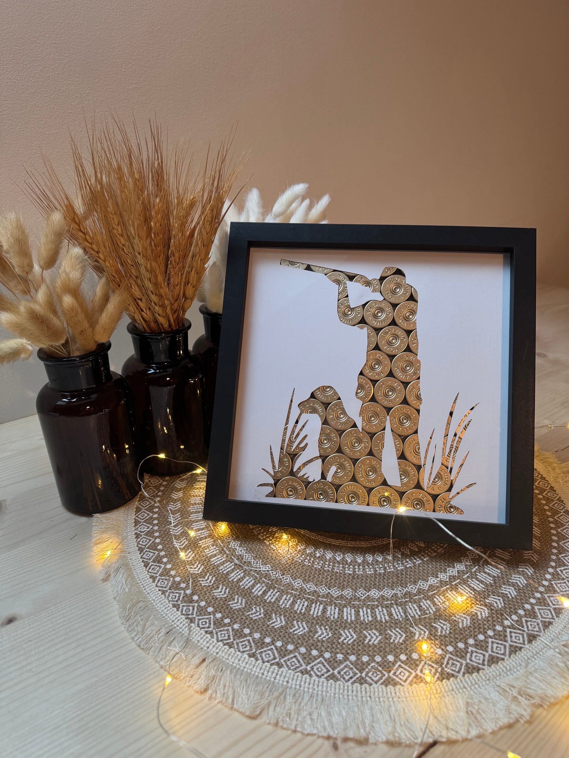 Magnifique cadre chasseur et chien avec des culots de cartouches dorés, une somptueuse feuille blanche laissant apparaitre la belle forme du chasseur et de son chien et pour finir un très jolie cadre de couleur noir.