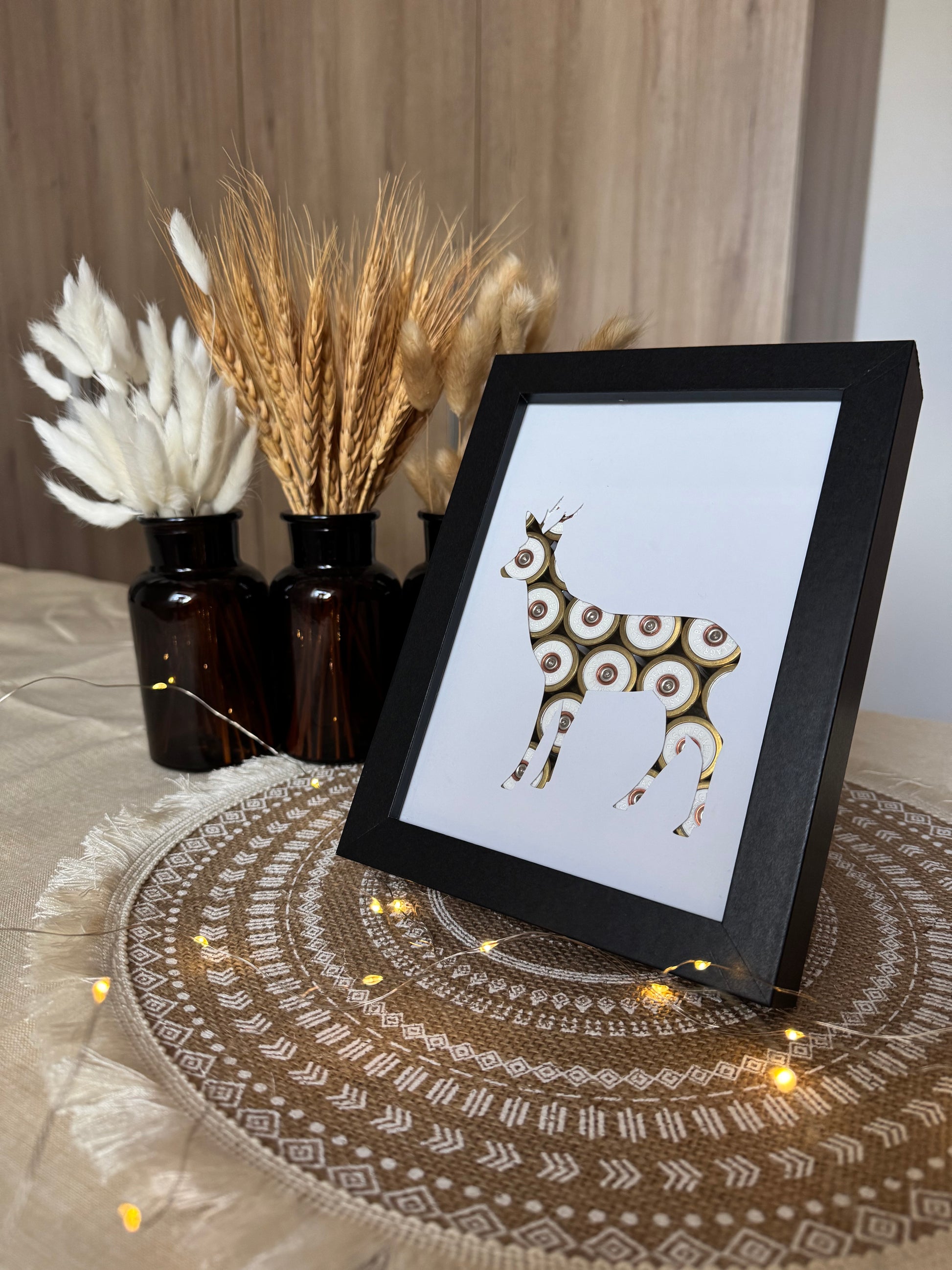 Magnifique cadre chevreuil avec des culots de cartouches dorés et blanches (édition limitée), une somptueuse feuille blanche laissant apparaitre la belle forme du chevreuil et pour finir un très jolie cadre de couleur noir.