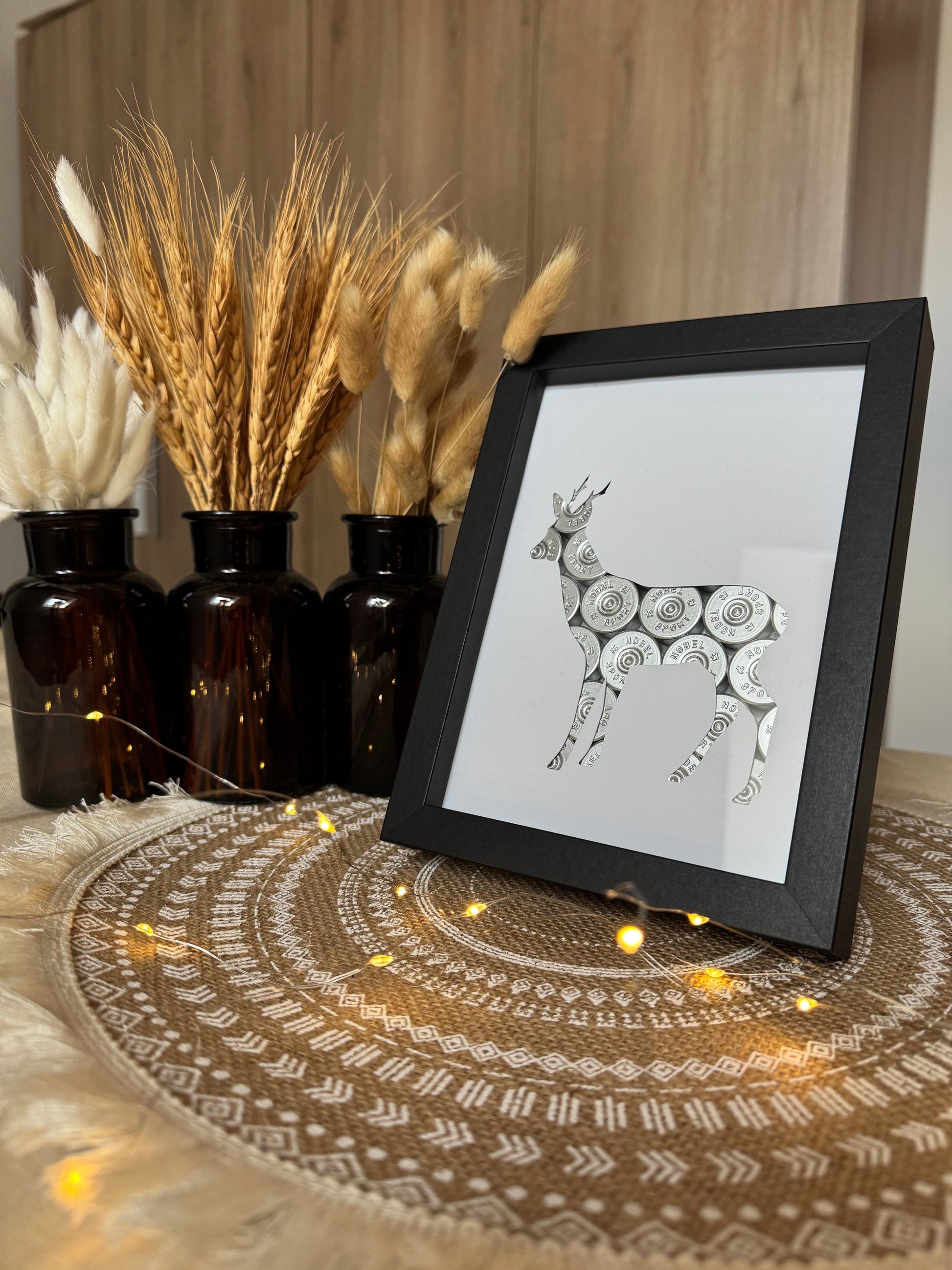 Magnifique cadre chevreuil avec des culots de cartouches argentés, une somptueuse feuille blanche laissant apparaitre la belle forme du chevreuil et pour finir un très jolie cadre de couleur noir.