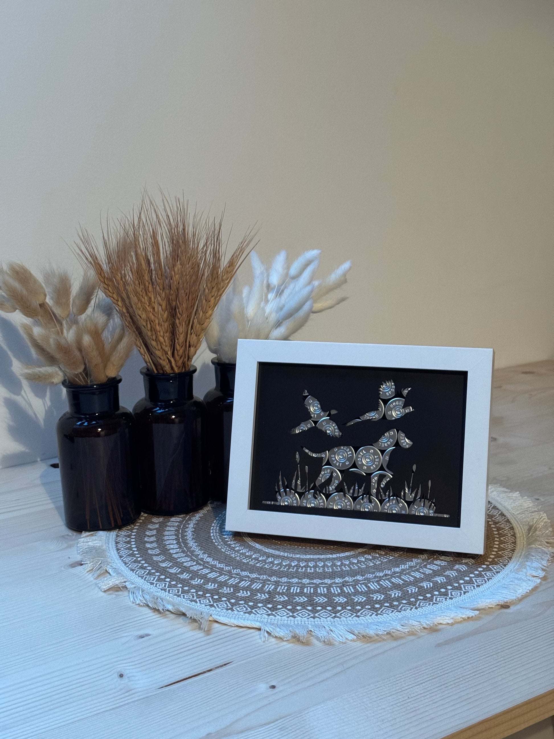 Magnifique cadre chien et faisans avec des culots de cartouches argentés, une somptueuse feuille noire laissant apparaitre la belle forme du chien et des faisans, et pour finir un très jolie cadre blanc.