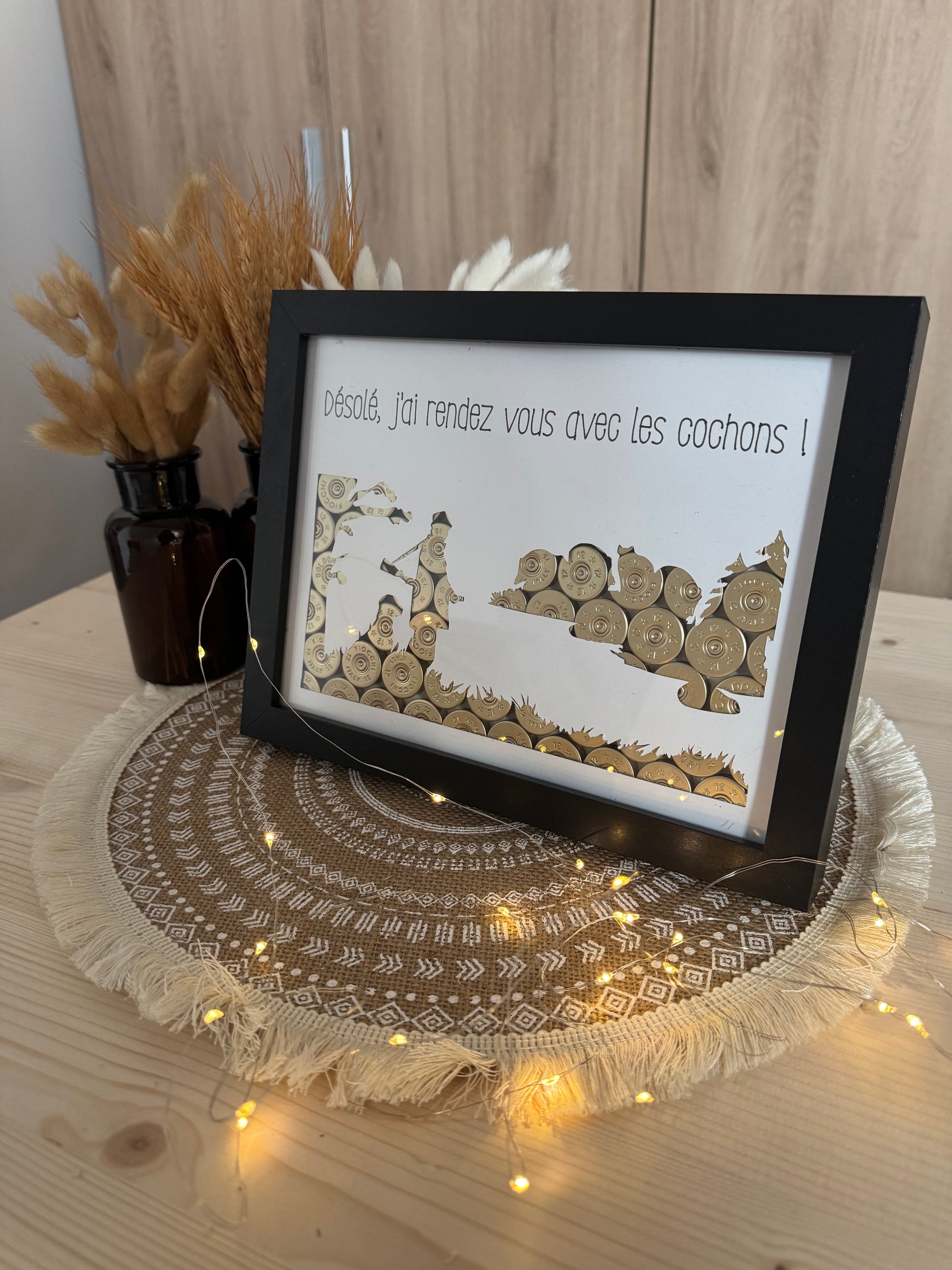Magnifique cadre chasseur, chien et sangliers avec le slogan "désolé, j'ai rendez vous avec les cochons !" avec des culots de cartouches dorés, une somptueuse feuille blanche et pour finir un très jolie cadre de couleur noir.