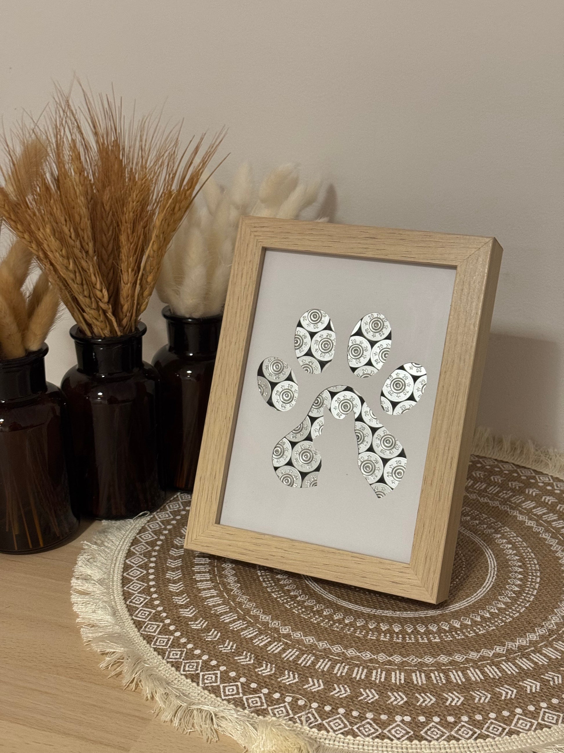 Magnifique cadre patte de chien avec des culots de cartouches argentés, une somptueuse feuille blanche laissant apparaitre la belle forme de la patte du chien et pour finir un très jolie cadre effet bois.