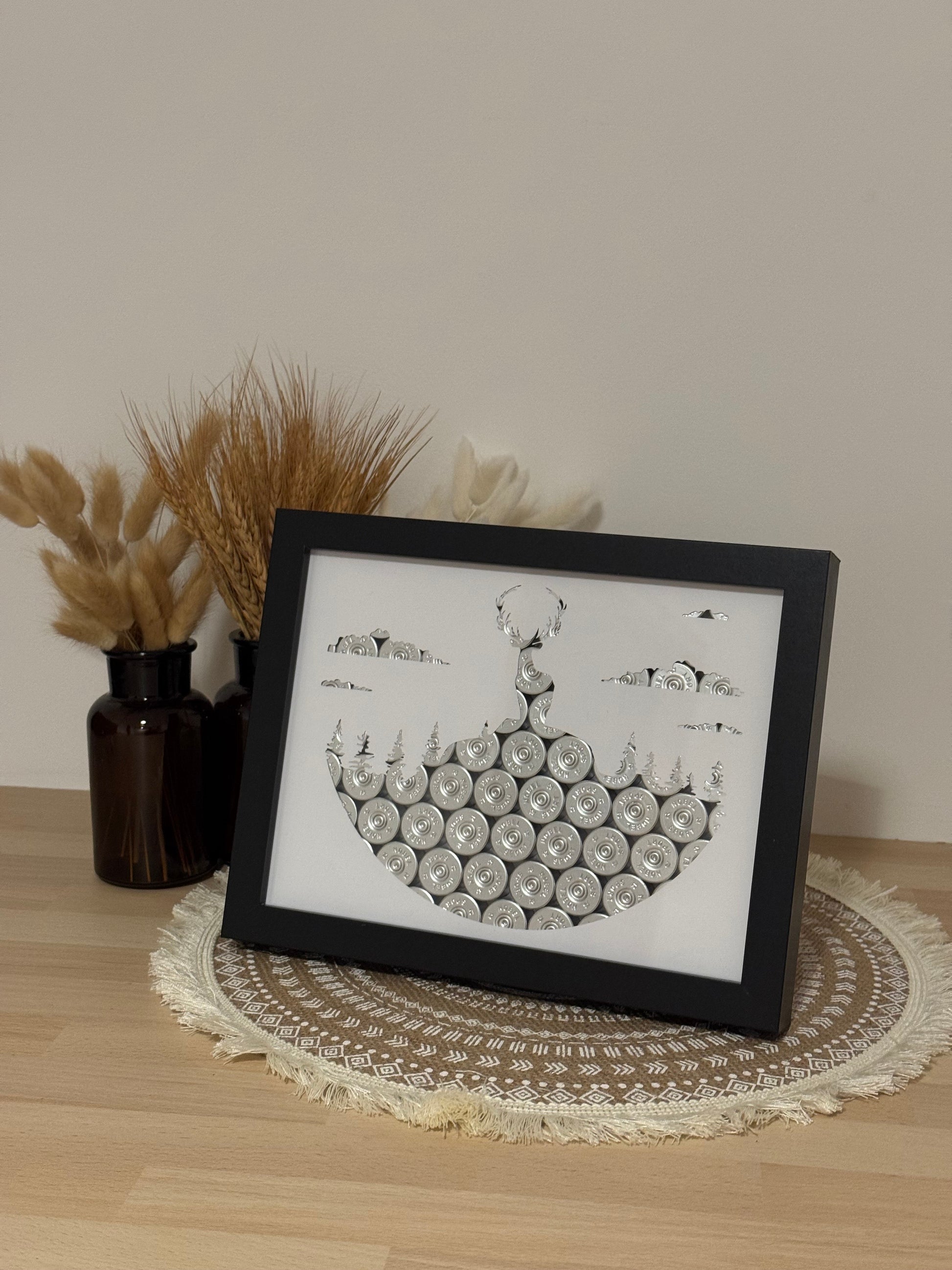 Magnifique cadre paysage cerf et forêt avec des culots de cartouches argentés, une somptueuse feuille blanche laissant apparaitre la belle forme du paysage et pour finir un très jolie cadre noir.