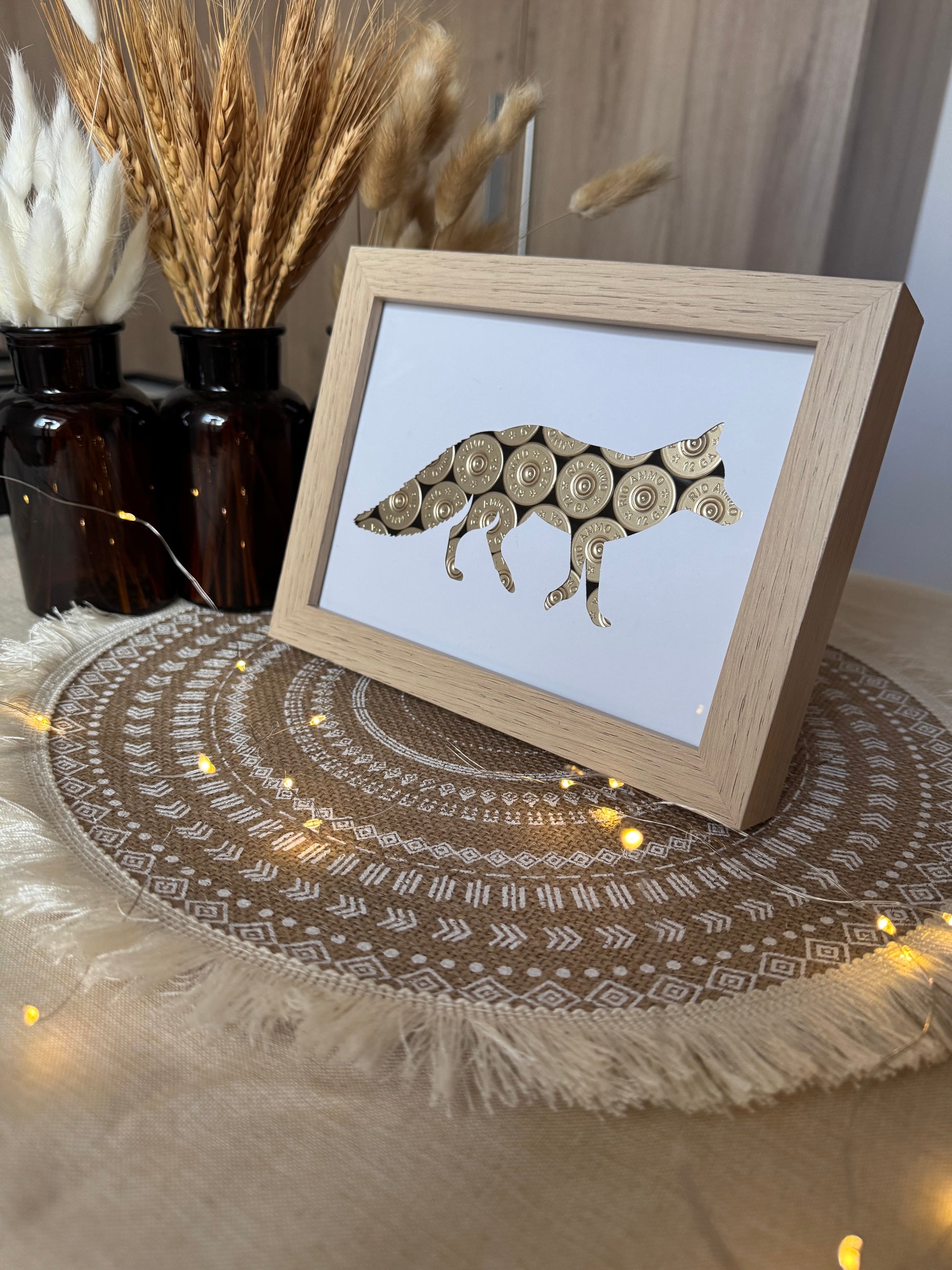 Magnifique cadre renard avec des culots de cartouches dorés, une somptueuse feuille blanche laissant apparaitre la belle forme du renard et pour finir un très jolie cadre effet bois.