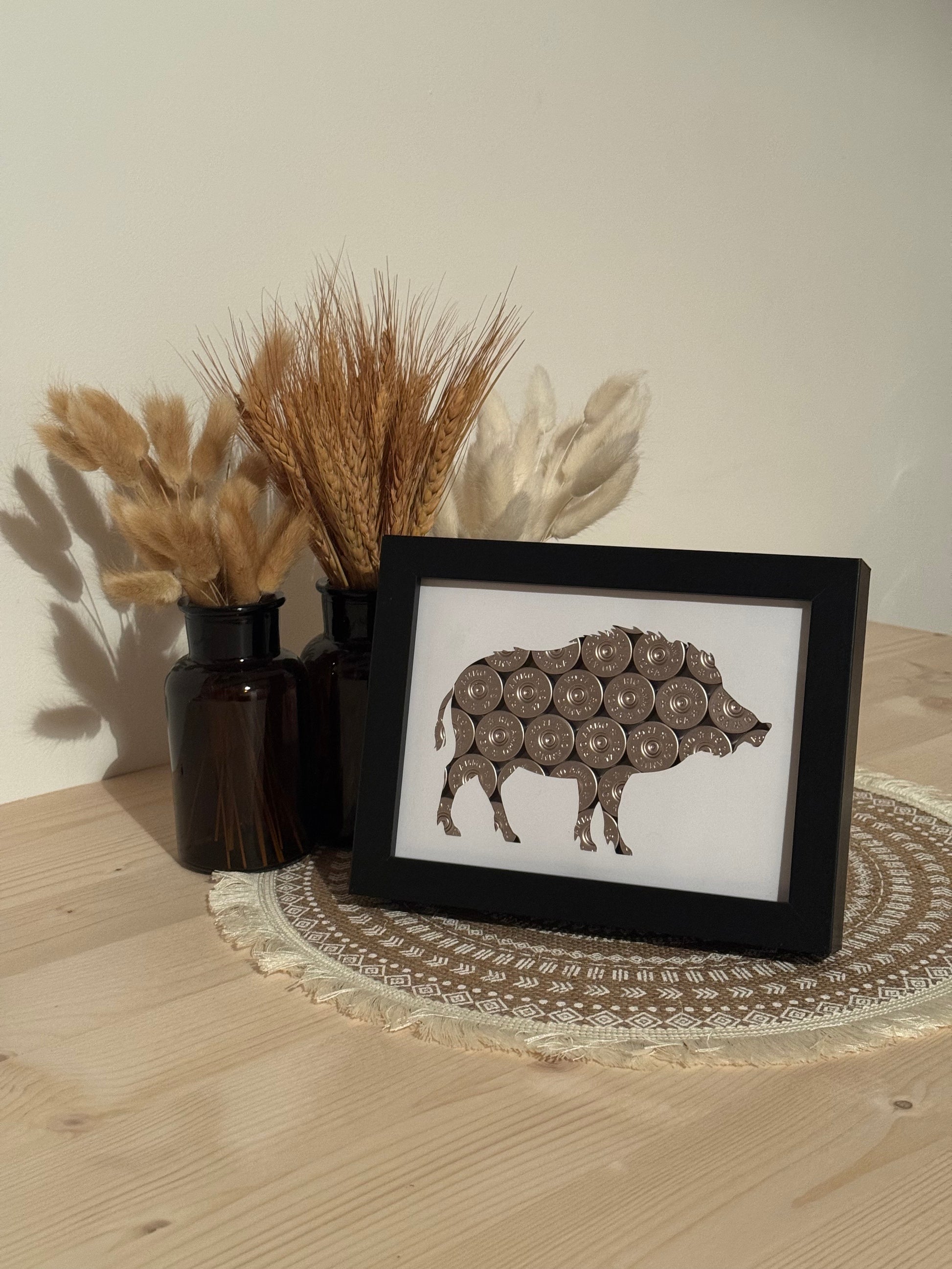 Magnifique cadre sanglier avec des culots de cartouches or rose, une somptueuse feuille blanche laissant apparaitre la belle forme du sanglier et pour finir un très jolie cadre noir.