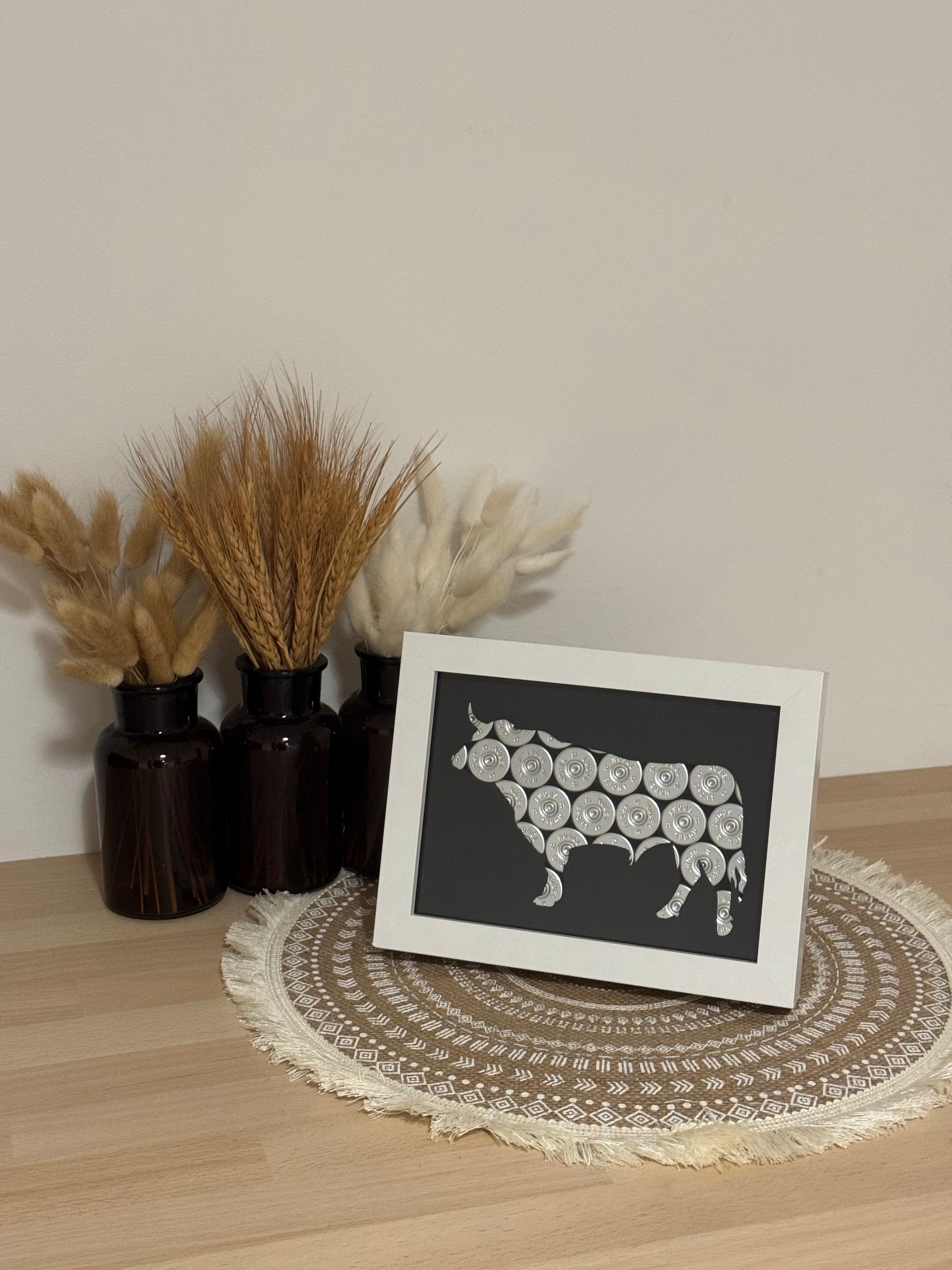 Magnifique cadre taureau avec des culots de cartouches argentés, une somptueuse feuille noire laissant apparaitre la belle forme du taureau et pour finir un très jolie cadre blanc.