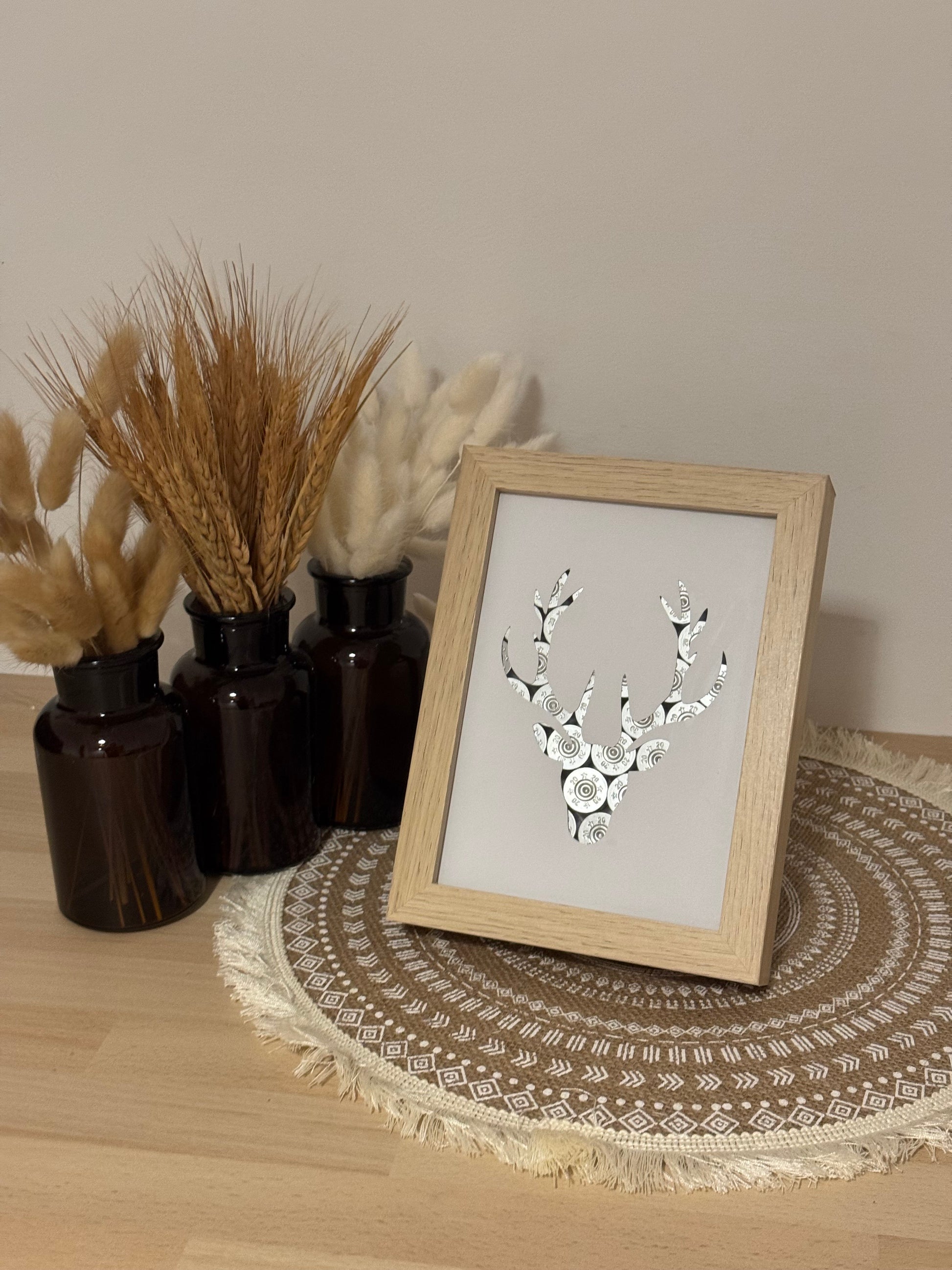 Magnifique cadre tête de cerf avec des culots de cartouches argentés, une somptueuse feuille blanche laissant apparaitre la belle forme du cerf et pour finir un très jolie cadre effet bois.