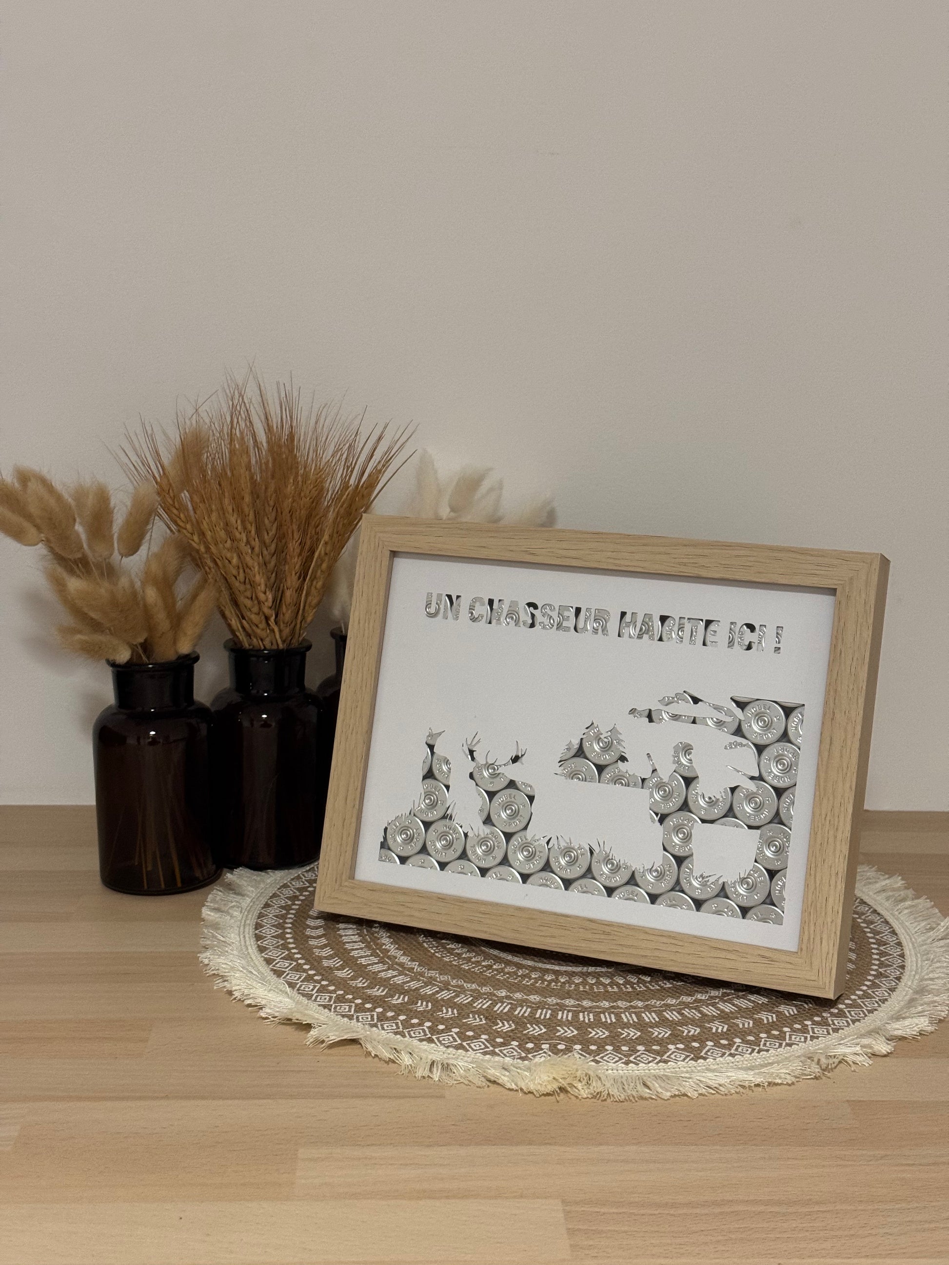 Je vous fait découvrir de magnifiques cadres fabriqués à la main par mes soins. Utilisant comme matière première des culots de cartouches de fusils. Idéale pour un magnifique cadeau ou simplement pour habiller votre intérieur de façon sobre et décalée !